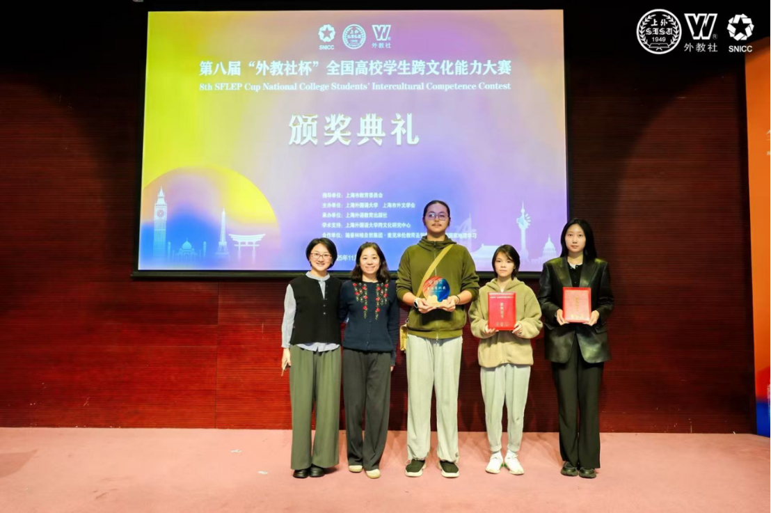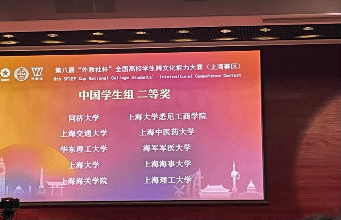 2025年11月8日至9日,第八届“外教社杯”全国高校学生跨文化能力大赛上海赛区决赛在上海外国语大学成功举办。来自复旦大学、同济大学、上海外国语大学等上海高校的英语专业及非英语专业选手同台竞技。由我校2022级针灸推拿学专业季聿墨、2025级中西医临床医学专业薛金金、以及药学(中外合作)专业夏宁三位同学组成的参赛团队,凭借扎实的专业功底、出色的英语表达与跨文化沟通能力,在29所高校参加的复赛中脱颖而出,以第二名的成绩顺利晋级决赛,并最终荣获上海赛区二等奖,并摘得“最佳案例”单项奖,充分展现了我校学子融贯中西的专业素养与胸怀天下的国际视野。