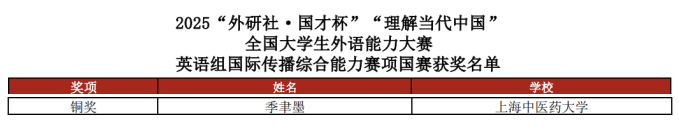 在此,向所有获奖同学致以热烈祝贺,向辛勤付出的指导老师们致以崇高敬意!愿这份荣誉成为激励更多上中医学子奋勇争先的动力,期待未来有更多青年学子以语言为翼,以梦想为帆,在语言学习的征程中勇毅前行,在跨文化传播的舞台上绽放光彩,用青春力量架起中外文明交流的桥梁,让中医药文化走向世界,让中国故事传遍全球!